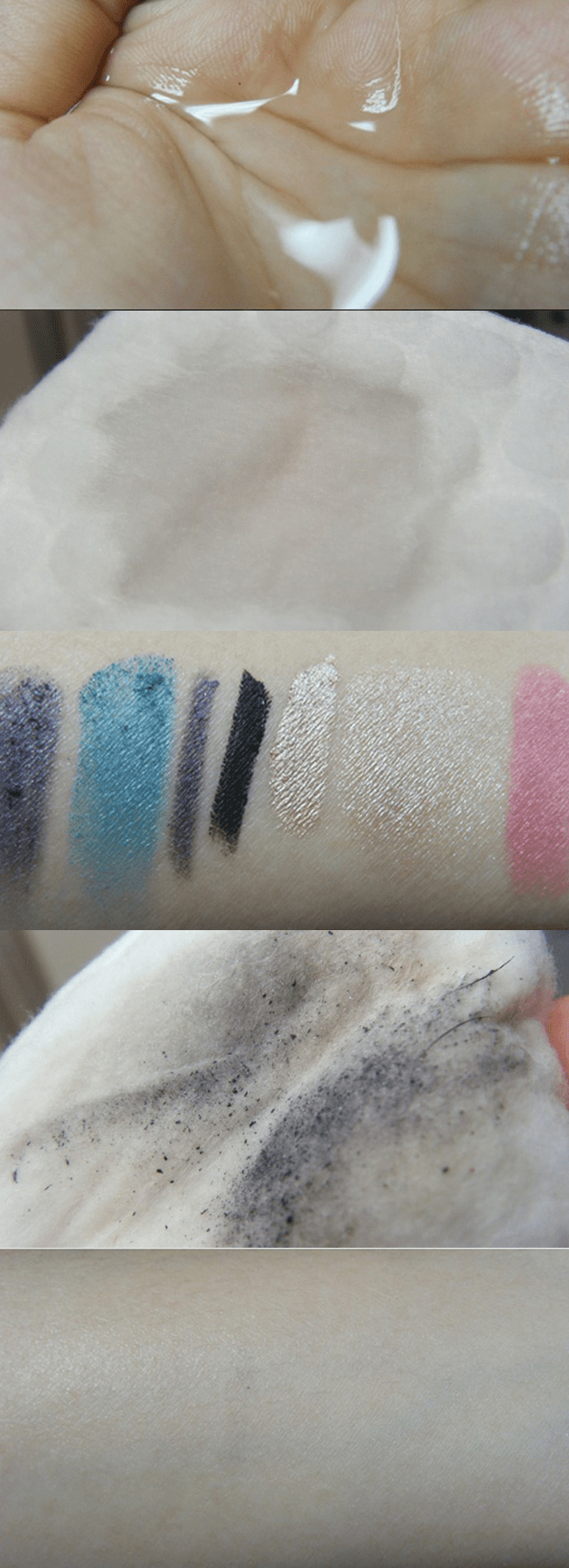 Đối với vùng mắt thấm ra bông cotton dung dich tẩy trang rồi áp lên vùng mắt khoảng 5 giây rồi mới lau nhẹ nhàng phấn mắt, mascara . Sau đó lây thêm bông cotton lau vùng môi, có thể dùng tẩy trang cho cả mặt.