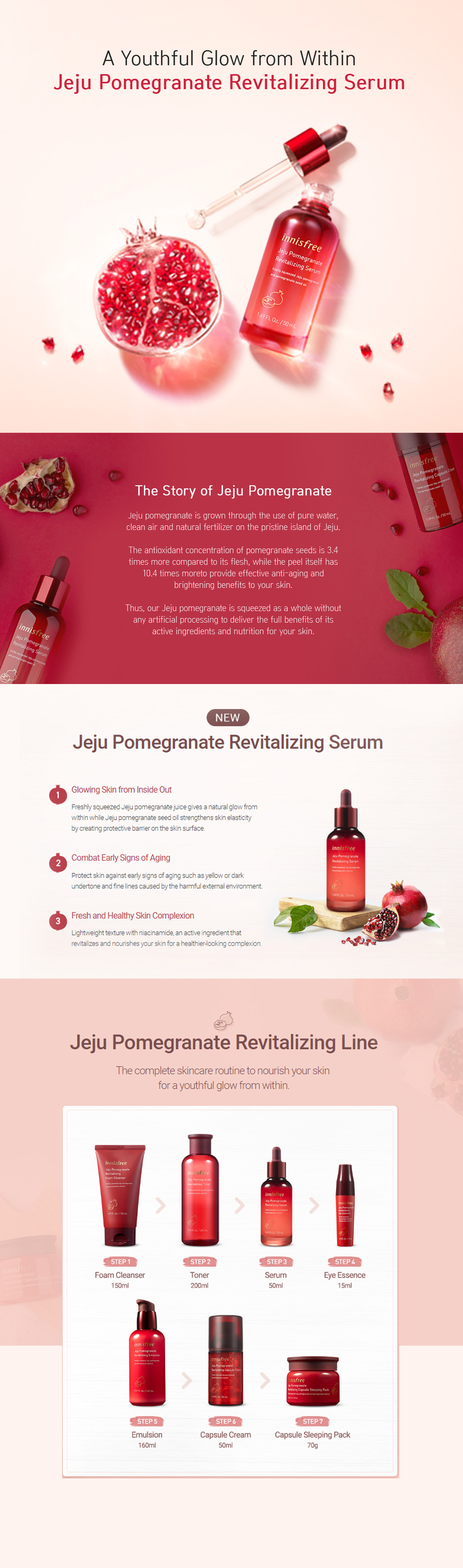 Tinh Chất Chiết Xuất Lựu Innisfree Jeju Pomegranate Revitalizing Serum 50ml là tinh chất có chứa nước ép lựu và tinh dầu hạt từ đảo Jeju, thẩm thấu sâu vào da, giúp da mịn màng và khỏe mạnh.