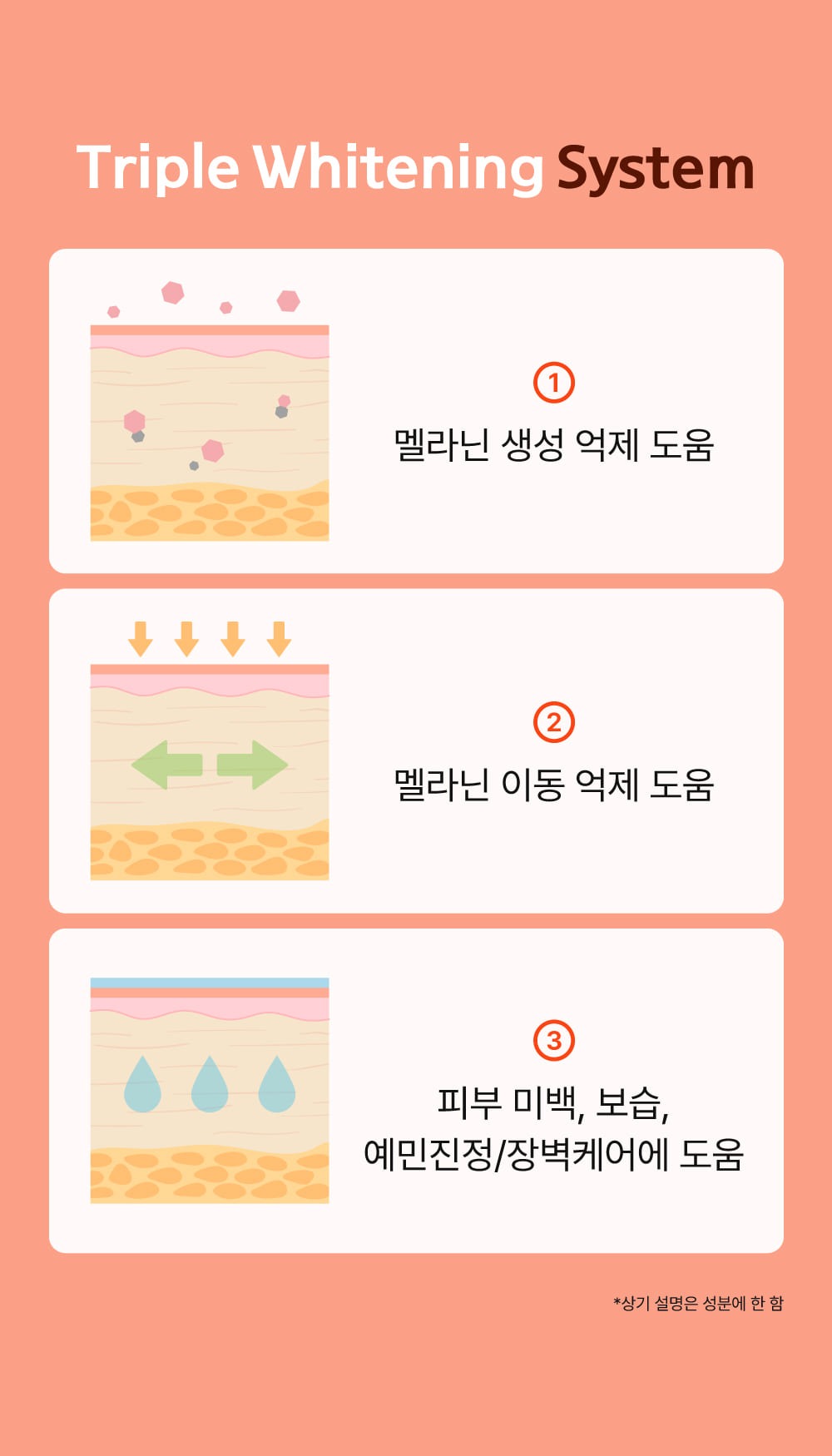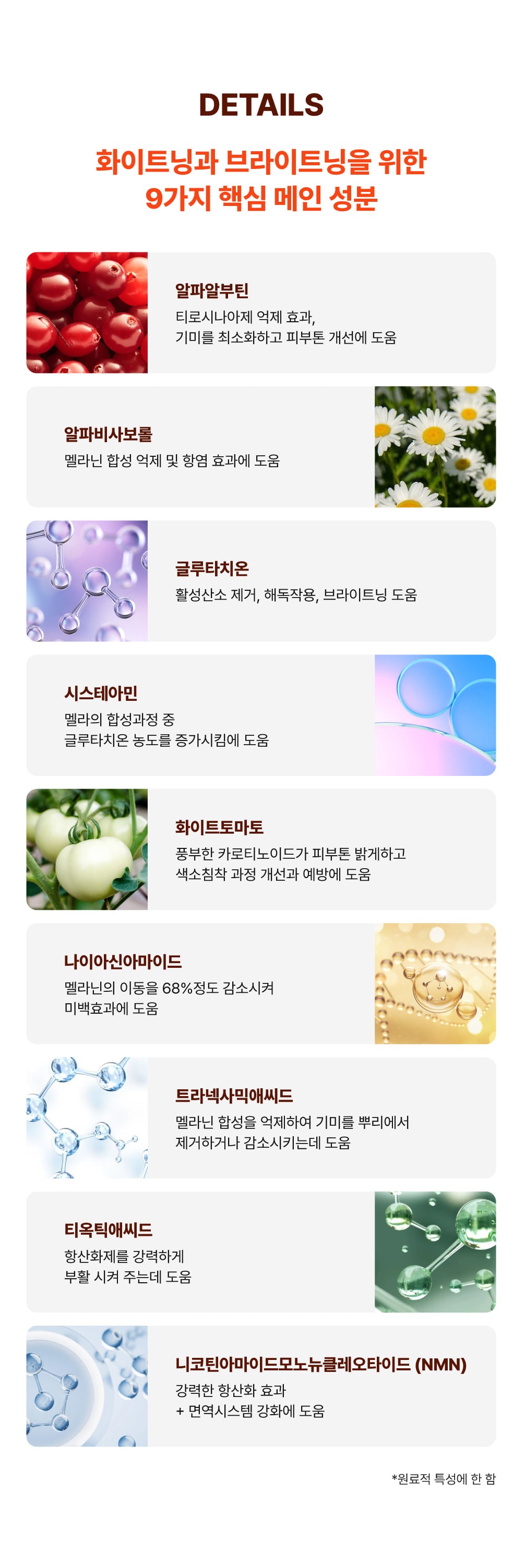 Cà chua trắng: Giảm sản sinh melanin mới, làm mờ vết thâm, sẹo và sẹo. Axit Alpha Lipoic: Làm chậm quá trình thoái hóa tế bào da, giảm nếp nhăn và tình trạng khô da.