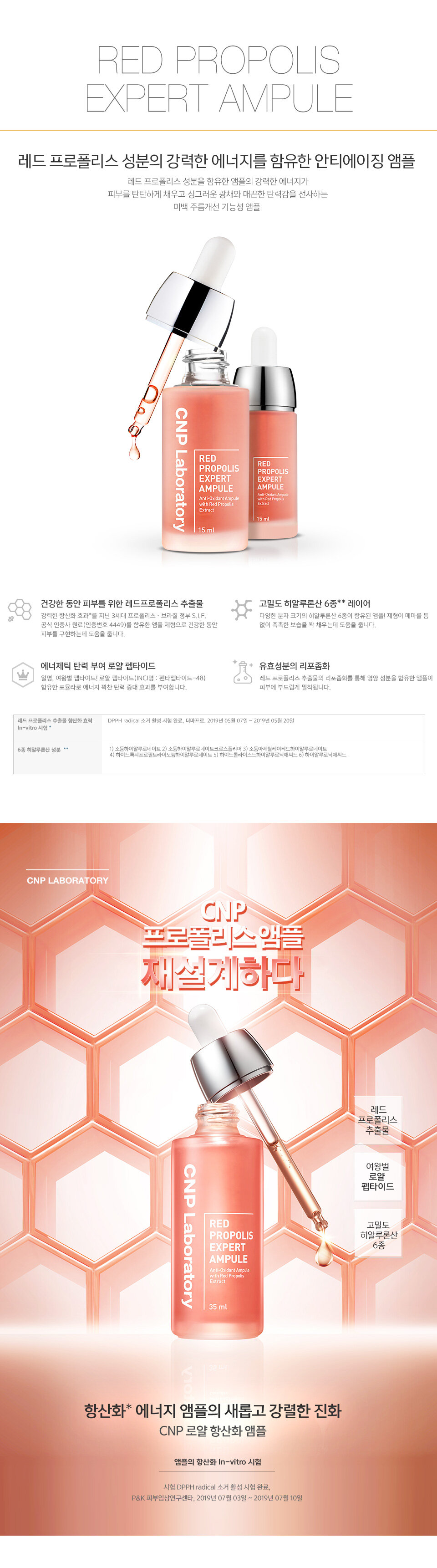 Tinh Chất Keo Ong Đỏ Duỡng Da Căng Mịn Và Chống Lão Hóa CNP Laboratory Red Propolis Expert Ampule 15ml là sản phẩm chứa 160.000ppm chiết xuất keo ong đỏ có chức năng chống oxy hoá mạnh mẽ, cải thiện nếp nhăn, giúp tăng cường sinh lực, làm căng da, mang lại vẻ rạng rỡ tươi mới và độ đàn hồi mịn màng cho da.