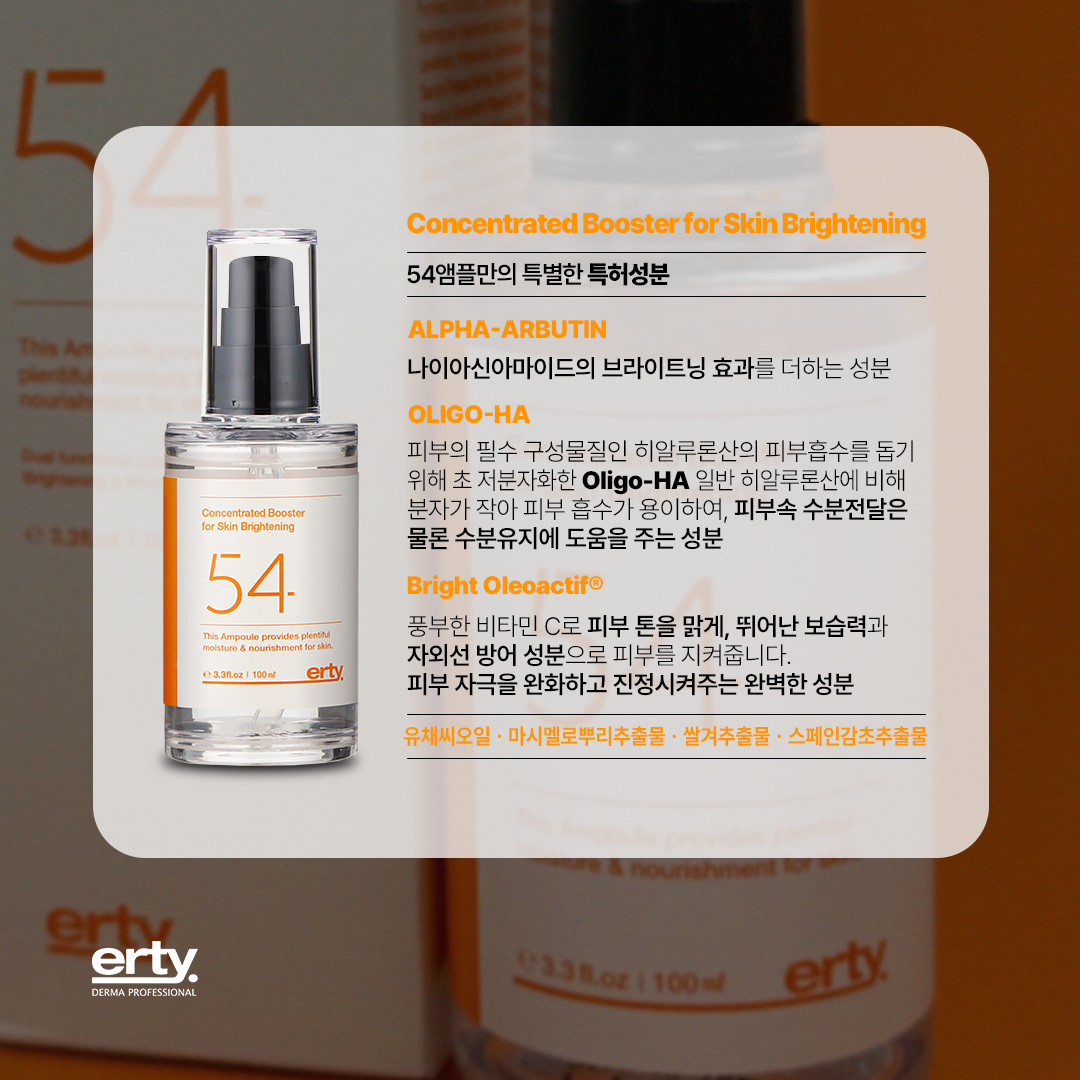 Erty 54 Ampoule là một sản phẩm chăm sóc da mạnh mẽ, đa chức năng được thiết kế để làm sáng, dưỡng ẩm và giảm sự xuất hiện của nếp nhăn, lý tưởng cho những ai đang tìm kiếm một làn da rạng rỡ và tươi trẻ.