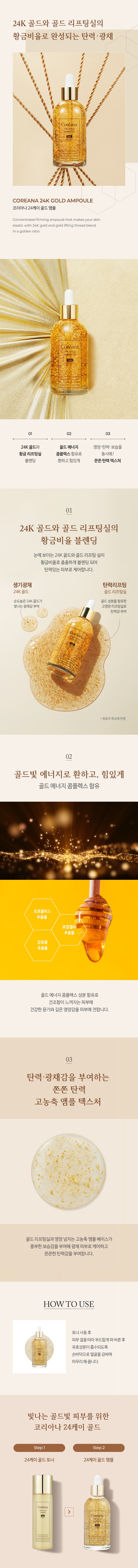 Coreana 24k Gold ampoule 100ml mang lại cho làn da của bạn độ đàn hồi và độ rạng rỡ đạt được nhờ tỷ lệ vàng của sợi nâng vàng 24K và vàng.