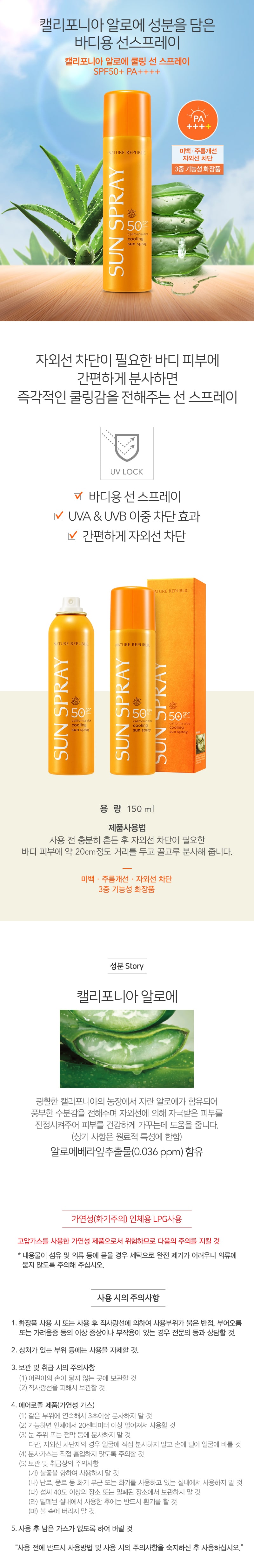 Xịt Chống Nắng Làm Mát Da Nature Republic California Aloe Cooling Sun Spray SPF50+PA++++150ml là xịt chống nắng chứa thành phần chiết xuất lô hội, Kim Chẩn Thảo từ Bắc Địa Trung Hải nhẹ dịu cho da, hoa Cúc La Mã của Pháp giúp thư giãn da, cùng với nước băng tinh khiết núi Whisler từ Canada giàu khoáng chất cân bằng độ ẩm và làm mát da. Xịt được cho mặt và body