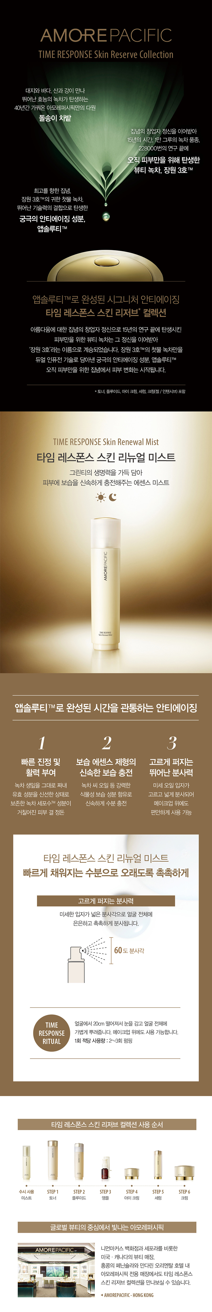 Xịt Dưỡng Tái Tạo Da Amore Pacific Time Response Skin Renewal Mist 200ml là xịt khoáng dưỡng da dạng phun sương phủ đậm đặc có chứa hỗn hợp nước trà xanh và chiết xuất từ thực vật bảo vệ hàng rào độ ẩm của da và giúp chống oxy hóa tối ưu, cải thiện làn da rạng rỡ, săn chắc và mịn màng.