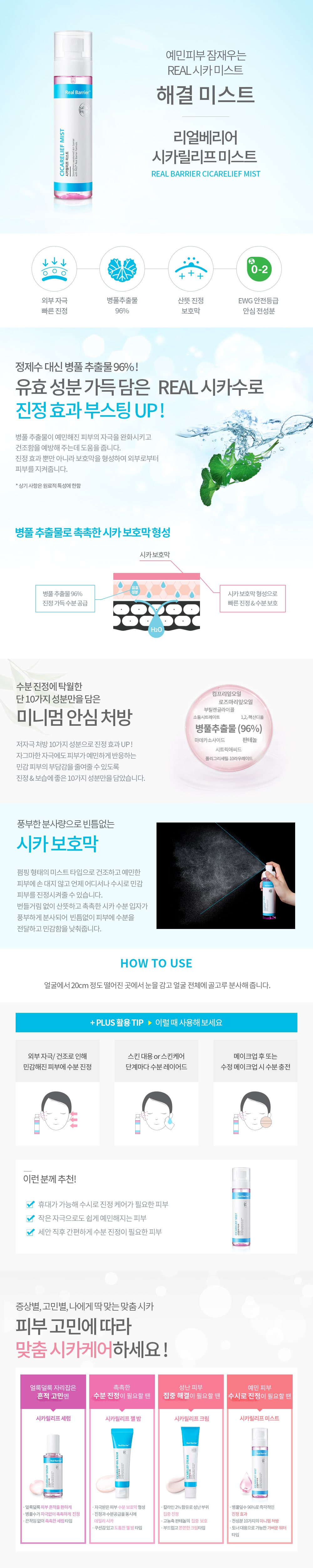 Xịt Khoáng Da Nhạy Cảm Thành Phần Rau Má Real Barrier Cicarelief Mist là xịt khoáng cấp nước ngay lập tức giúp cung cấp độ ẩm, làm mịn và dịu da nhạy cảm với thành phần 96% dẫn xuất rau má và các thành phần đạt chuẩn EWG Green và không chứa 10 thành phần gây hại cho da.