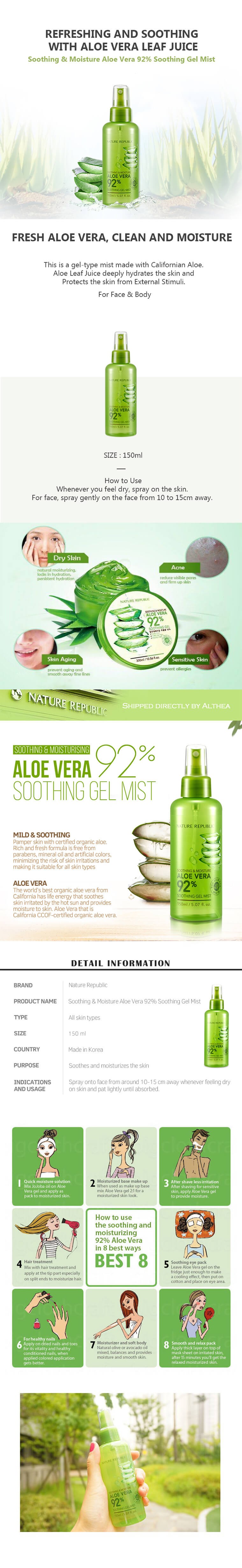 Xịt Khoáng Lô Hội Nature Republic Soothing & Moisture Aloe Vera 92% Soothing Gel Mist 150ml là xịt khoáng chiết xuất Nha đam cung cấp độ ẩm và bảo vệ da khỏi tác hại của môi trường bên ngoài. Sản phẩm được chứng nhận bởi tổ chức chứng nhận sản phẩm hữu cơ CCOF. Ngoài ra xịt khoáng còn có các tác dụng khác như se lỗ chân lông, làm dịu da cháy nắng, sử dụng được cho cả mặt và tay chân