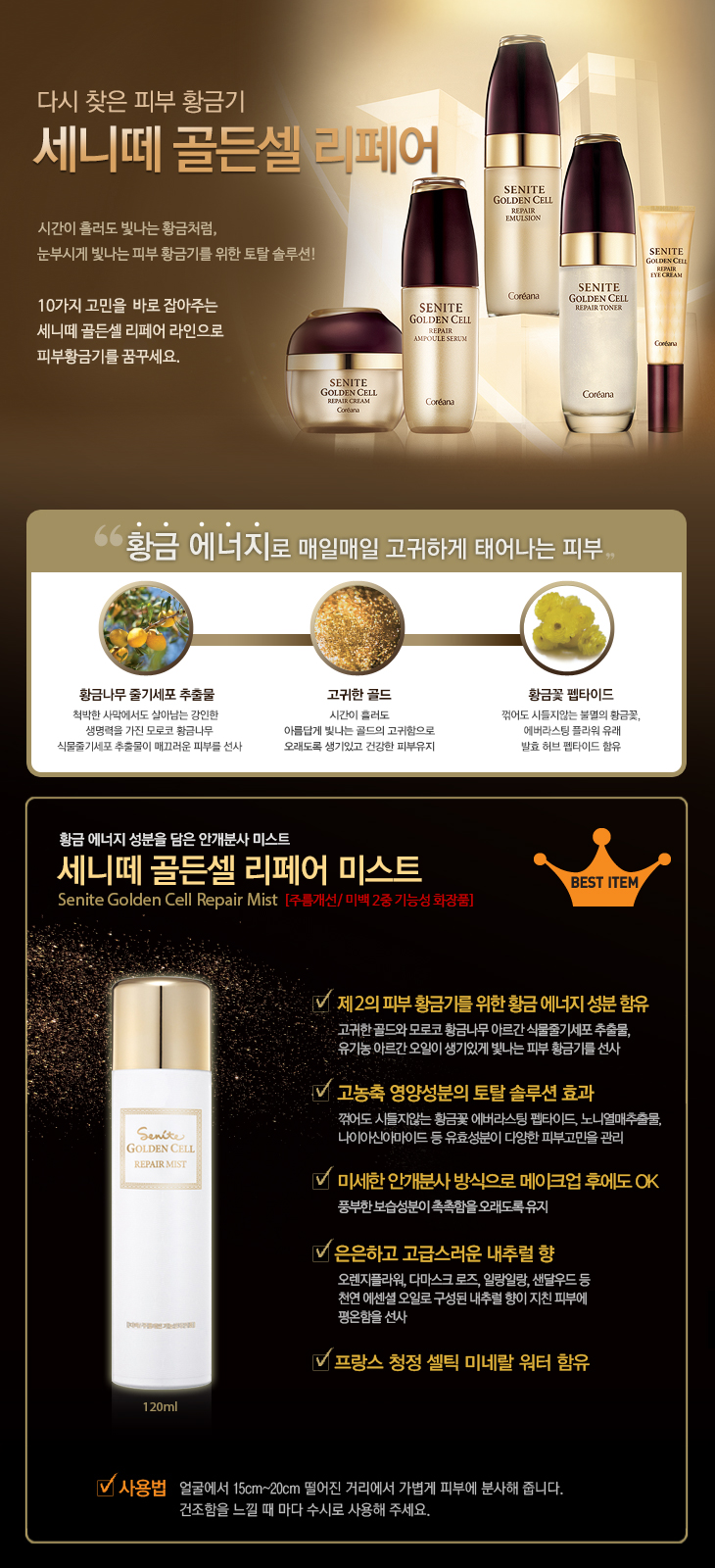 Xịt dưỡng phục hồi tế bào Coreana Senite Golden Cell Repair Mist là một sản phẩm xịt khoáng được phun đều lên da theo dạng sương mù mịn để cung cấp độ ẩm cho làn da khô và làm cho da sáng và đàn hồi.